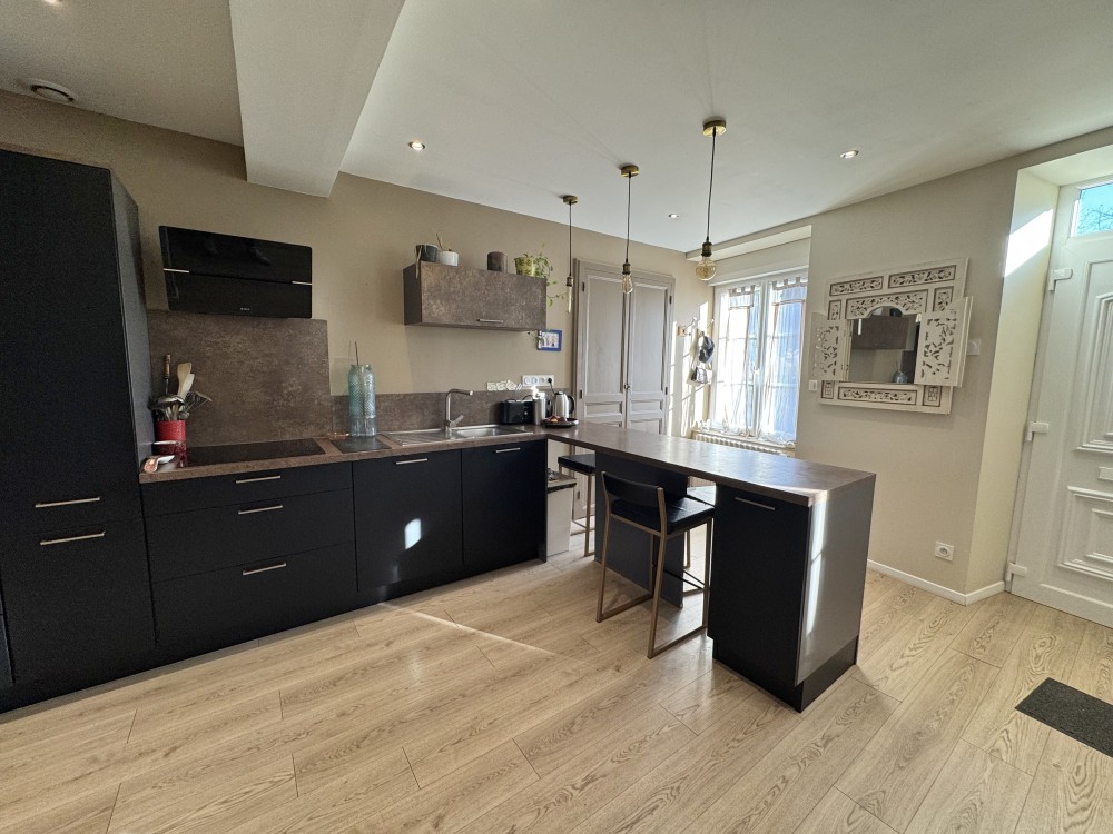 - Au RDC: entrée donnant dans un séjour/salon avec poêle à bois avec cuisine ouverte équipée et aménagée (d'environ 42 m²), une extension (d'env. 12 m²) avec W.C. et une remise à usage de buanderie (d'env. 10 m²).