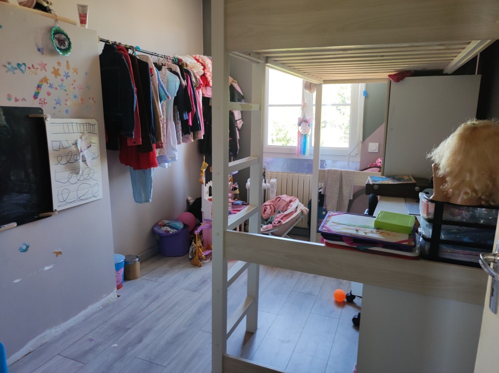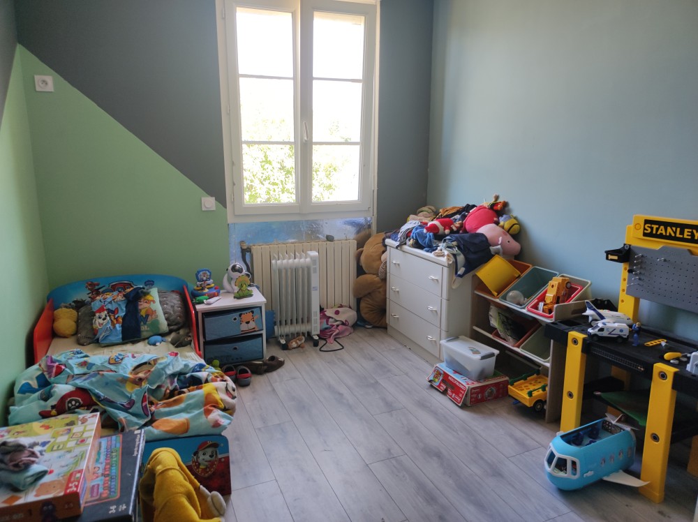 A l’étage : un couloir dessert trois chambres et une pièce avec arrivée d’eau.