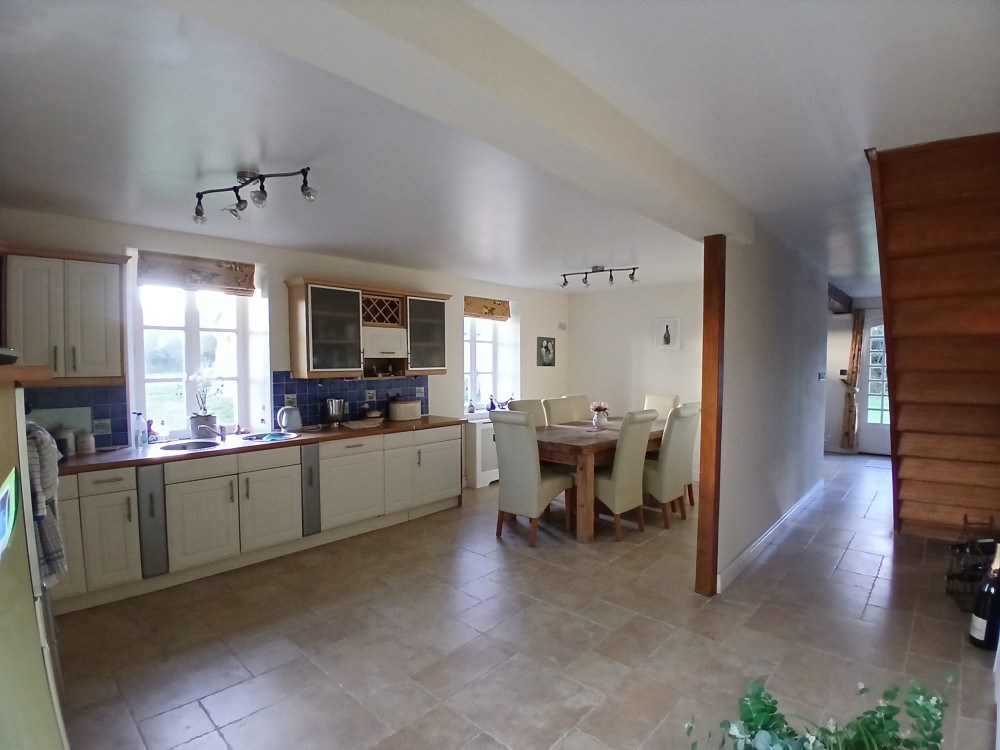 Au rez de chaussée: un séjour/salon (d'env. 36 m²) avec cheminée (un poêle à bois), une cuisine aménagée et équipée (d'env. 27 m²), une buanderie (d'env. 12 m²), un WC.