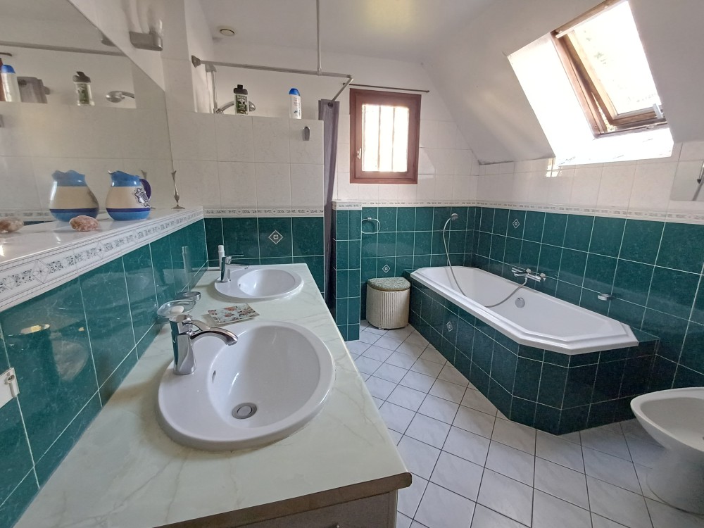 Au deuxième niveau mansardé : un bureau avec terrasse (environ 14 m² au sol), deux chambres (environ 9 et 12 m² au sol) et une petite salle d'eau.