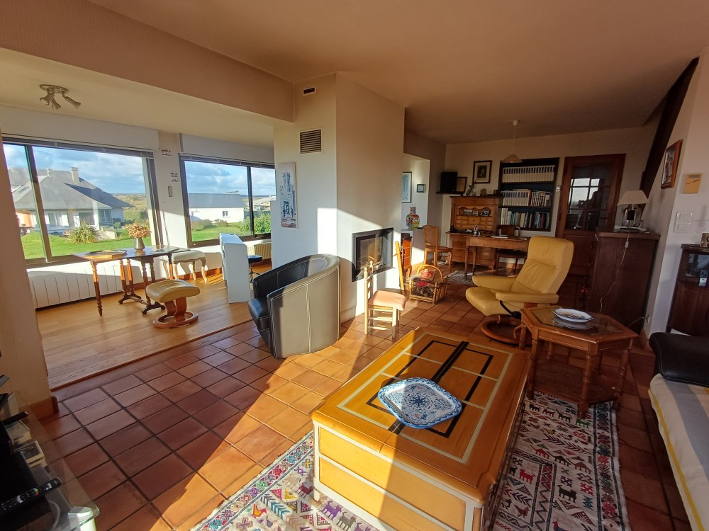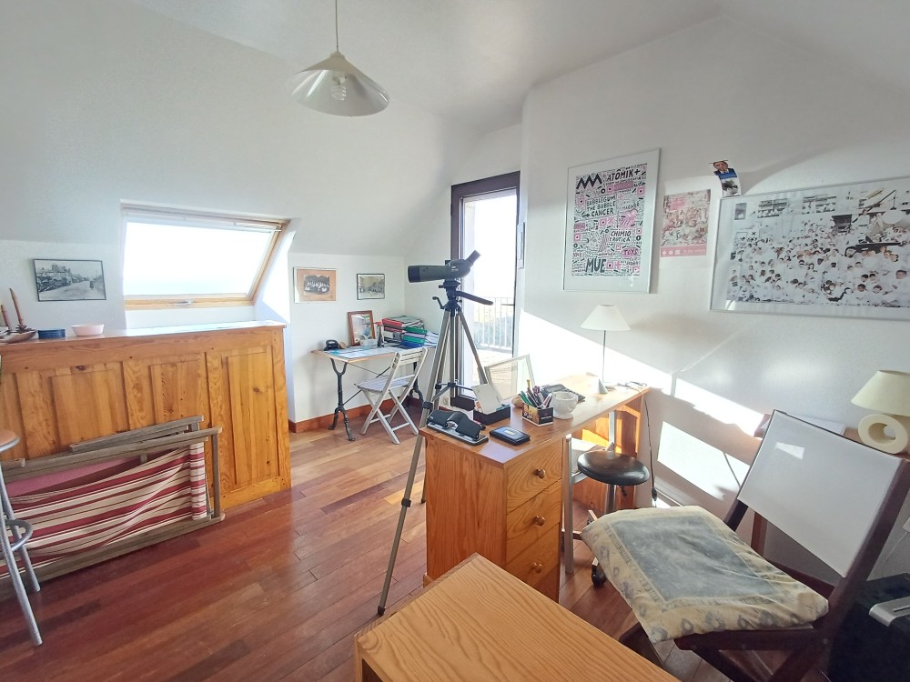 Au premier niveau : séjour/salle à manger d'environ 44 m² avec insert ouvert sur un coin salon avec très belle vue sur mer d'environ 15 m², cuisine aménagée et équipée d'environ 12 m², deux chambres d'environ 9 et 15 m², salle de bains d'environ 6 m² et WC.