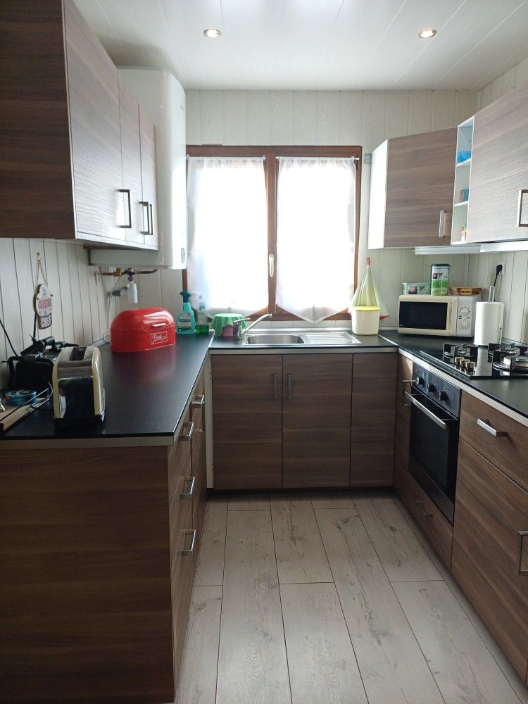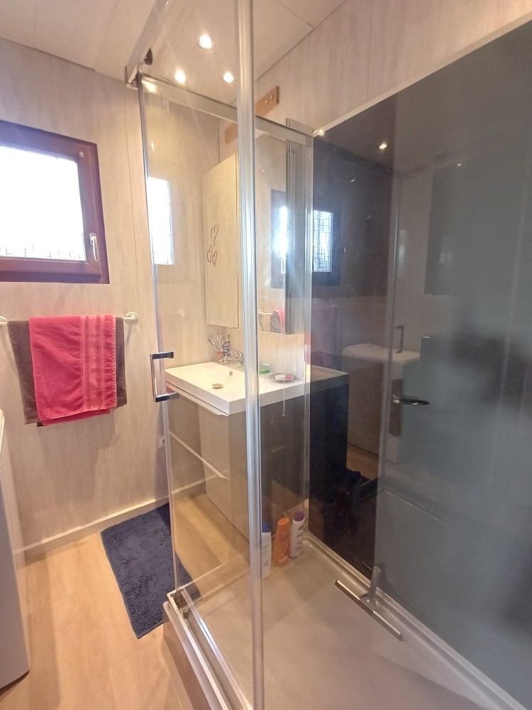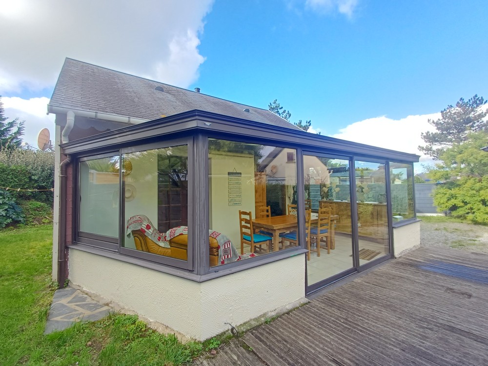 Véranda, salon avec poêle à granulés ouvert sur une cuisine aménagée et équipée, deux chambres, salle d’eau et WC.