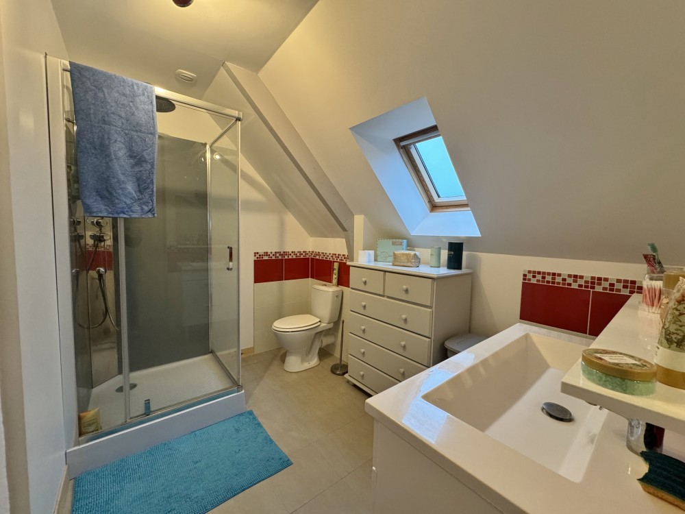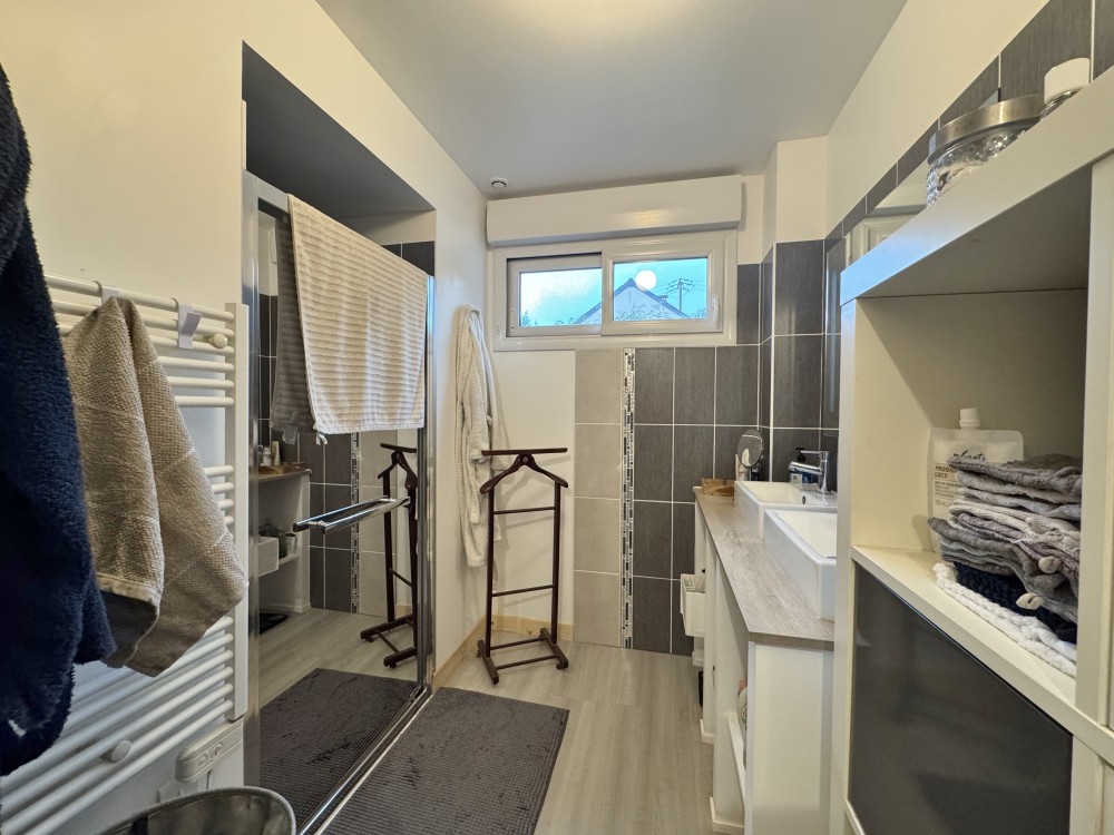 - Au RDC: hall d'entrée desservant un séjour/salon avec poêle à bois (d'environ 32 m²), une cuisine aménagée (d'env. 15 m²), W.C suspendus avec lave-mains, une chambre avec salle d'eau et dressing (d'env. 18 m²).